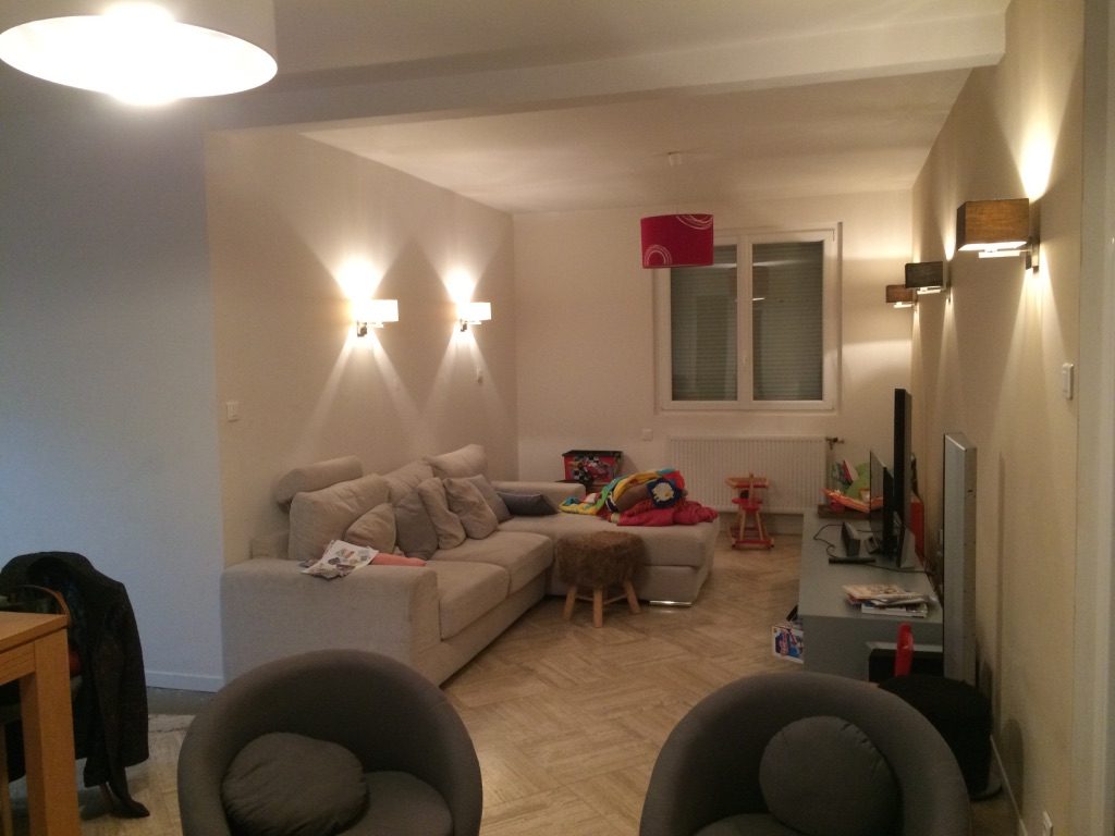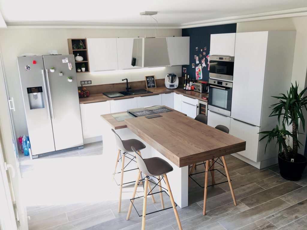Un point important de cette aménagement était le travail de la lumière, car aillant l'espace de vie du côté Nord, le ressentit était particulièrement froid et sombre. En réponse à cette problématique, nous avons choisis d'ouvrir la cuisine sur un mur complet afin d'intégrer un espace repas, ce qui nous à permis de fermer la porte d'accès à la cuisine qui donnait au milieu du séjour. L'espace de circulation dédié uniquement à une montée d'escalier était maintenant intégrer à l'espace cuisine, ce qui à redonné du volume à cette pièce anciennement étroite, et a permis à la lumière de traverser les différentes pièces du rez-de-chaussé.