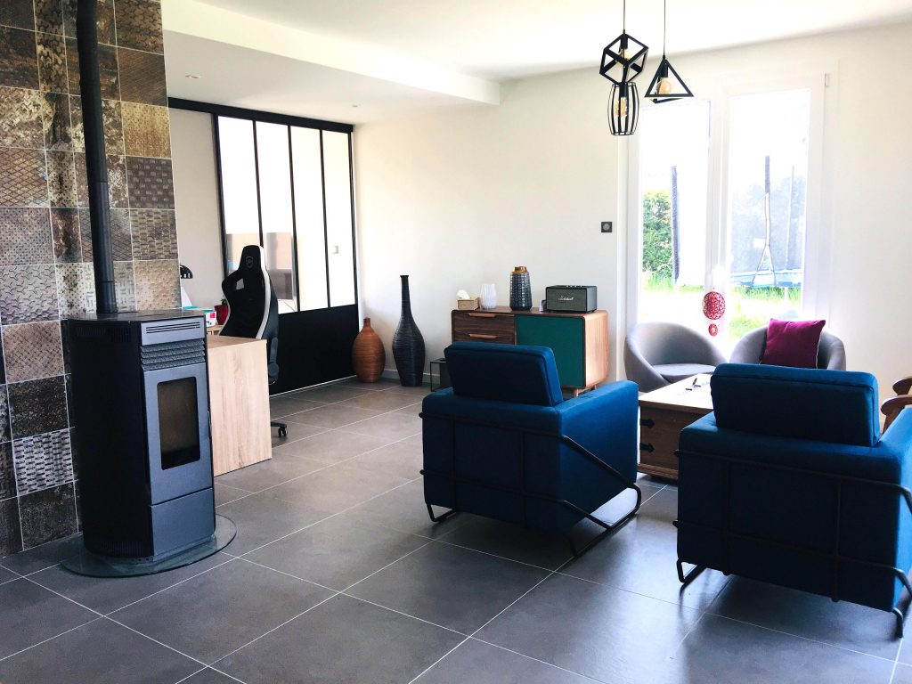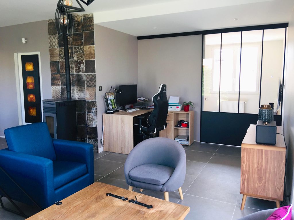 La verrière mise en place permet de séparer le coin télévision du salon, de laisser passer la lumière mais aussi d'amoindrir le son de la télévision. Le bureau (pas encore réalisé sur la photo) et la verrière donnent par la même occasion un rendu plus contemporain & optimise cet espace qui n'était pas exploité auparavant.