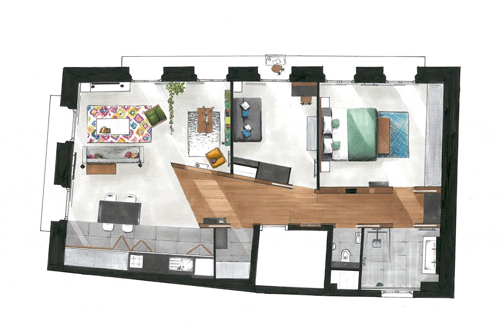 Nous avons ici un aménagement dynamique & ludique de par son mobilier mais aussi de part sa forme. Un appartement aménagé pour des adultes qui veulent rester dans un imaginaire enfantin.